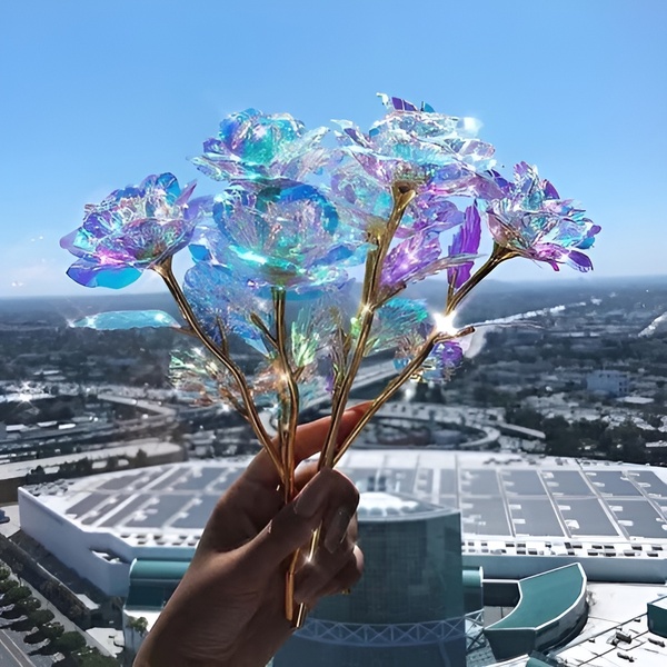 Každá ruža je vyrobená s dúhovým, holografickým povlakom, ktorý sa na svetle nádherne trbliece a vytvára trblietanie pripomínajúce galaxiu, ktoré je jednoducho fascinujúce.